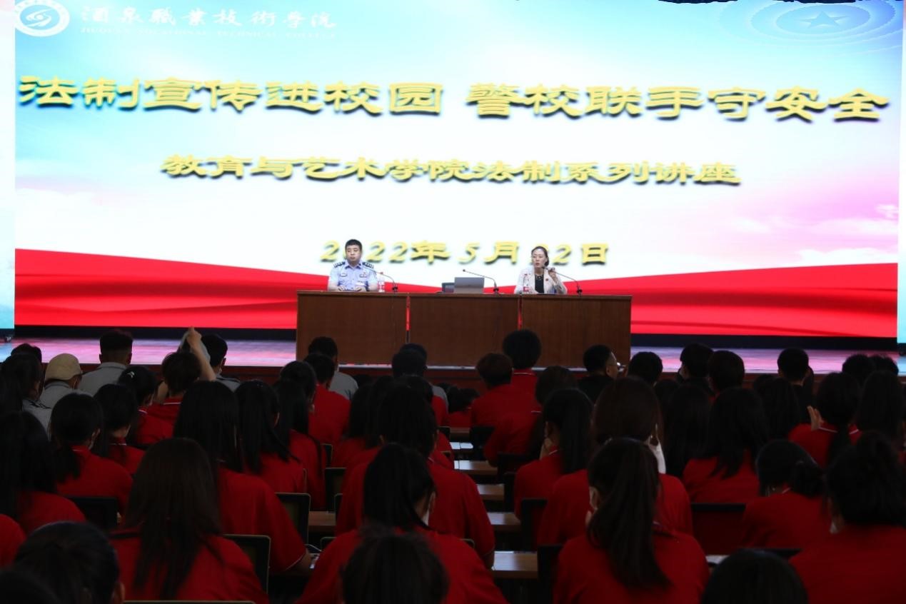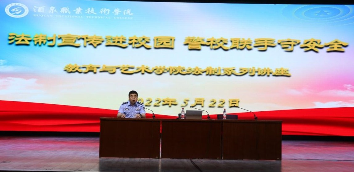 为深入学习宣传贯彻习近平法治思想,落实必赢766net手机版“八五”普法、平安校园建设等工作任务,开展法制宣传教育,大力弘扬法治精神,提高学生法制观念,树立知法守法、用法护法意识,营造良好的法制教育环境,增强法制教育的实效性,推进校地共建平安“酒职”。5月22日,必赢766net手机版与酒泉市公安局肃州分局火车站派出所联合开展“法制宣传进校园 警校联手守安全”法制宣传教育专题讲座。