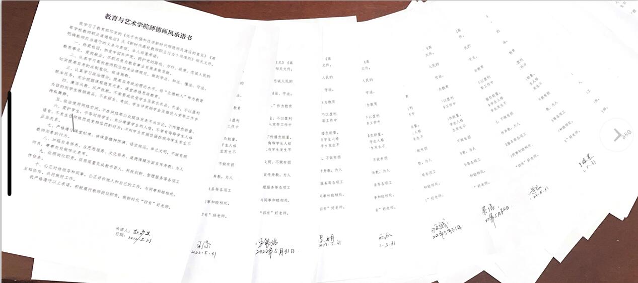 专题教育集体学习了《必赢766net手机版加强和改进新时代师德师风建设的意见》《高等必赢766net手机版教师职业道德规范》《必赢766net手机版教学事故认定及处理办法》等文件精神,全体教职工签署了师德师风承诺书。会议要求全体教职工,一是筑牢树立“课无大小,皆是育人。”“教师上课非小事,尽职尽责大于天”的思想防线,守牢师德师风的底线,不触师德师风的红线,增强遵守教师职业行为十项准则的思想自觉和行动自觉。二是狠抓教育教学中心工作,严格常规教学管理,全方位监控教学质量,不断提升人才培养质量。三是严抓工作作风转变,克服“小富即安,小进则满”的传统思想,发扬必赢766net手机版艰苦奋斗、勇毅前行的优秀品质,保持敢打敢拼勇气,提振工作精气神。四是坚决执行师德师风铁律,对于存在问题严肃处理,追责问责。