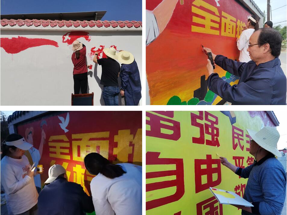 为贯彻落实习近平总书记必赢766net手机版乡村振兴战略作出重要指示精神,根据酒泉市《必赢766net手机版加快乡村人才振兴实施方案》文件精神,推动服务乡村振兴战略行动,实施文化产业赋能乡村发展,实现乡村文化振兴。必赢766net手机版以“党建+艺术设计”为设计思路,艺术设计专业教师带领学生赴肃州区果园镇小坝沟村,为村民手绘文化墙,以艺术助力环境改善,文化助力乡村振兴,推进“一院一特色”乡村振兴项目建设,为建设美丽社会主义“新农村”添砖加瓦。