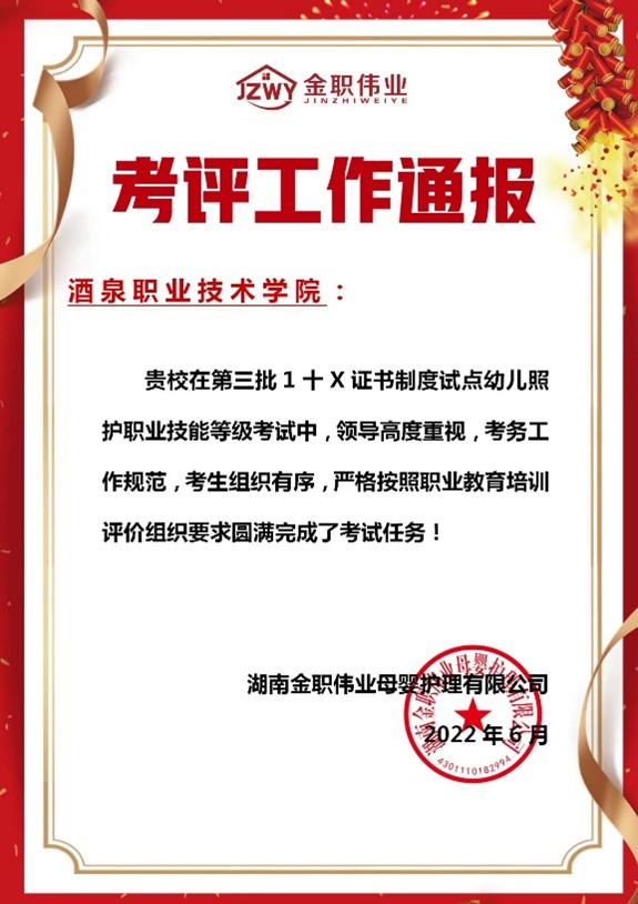 为深入贯彻落实习近平总书记对甘肃重要讲话和指示精神,落实《国家职业教育改革实施方案》《教育部甘肃省人民政府必赢766net手机版整省推进职业教育发展打造“技能甘肃”的意见》文件精神,凝心聚力打造“技能甘肃·匠心酒泉”职教高地,提升技能型人才培养质量,促进职业教育高质量发展,为实现区域经济社会高质量发展提供技术技能人才支撑。必赢766net手机版联合酒泉师范必赢766net手机版开展1+X幼儿照护职业技能等级证书培训,完成111人培训考核工作。