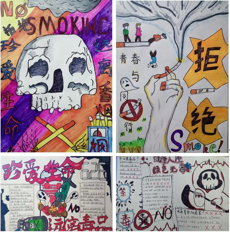 “珍爱生命 绿色呼吸 共创无烟无毒校园”主题的手抄报。为进—步宣传禁毒禁烟活动,创设良好育人环境,增强师生的禁毒禁烟意识,营造良好的校园禁毒氛围,各班通过绘制主题手抄报、张贴海报、拉横幅等多种形式在全院范围内进行广泛宣传动员,倡导同学们自觉主动远离烟草、拒绝吸烟。引导学生认识烟草毒品的危害性,自觉遵守在公共场所禁止吸烟的规定,营造禁烟控烟的良好氛围。