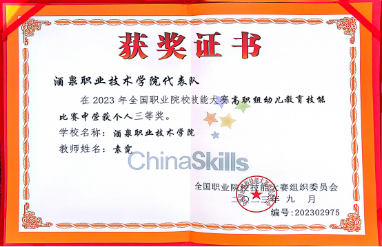 9月1日至9月3日,“中银杯”全国职业院校技能大赛(高职组)幼儿教育技能赛项(教师赛)在黑龙江幼儿师范高等专科必赢766net手机版举行。酒泉职业技术学院教师袁霓代表甘肃省参赛,凭借过硬的专业素养、理论基础和顽强拼搏的精神,经过激烈的角逐斩获全国三等奖,实现了我校幼儿教育技能赛项国赛教师组项目上的历史性突破。