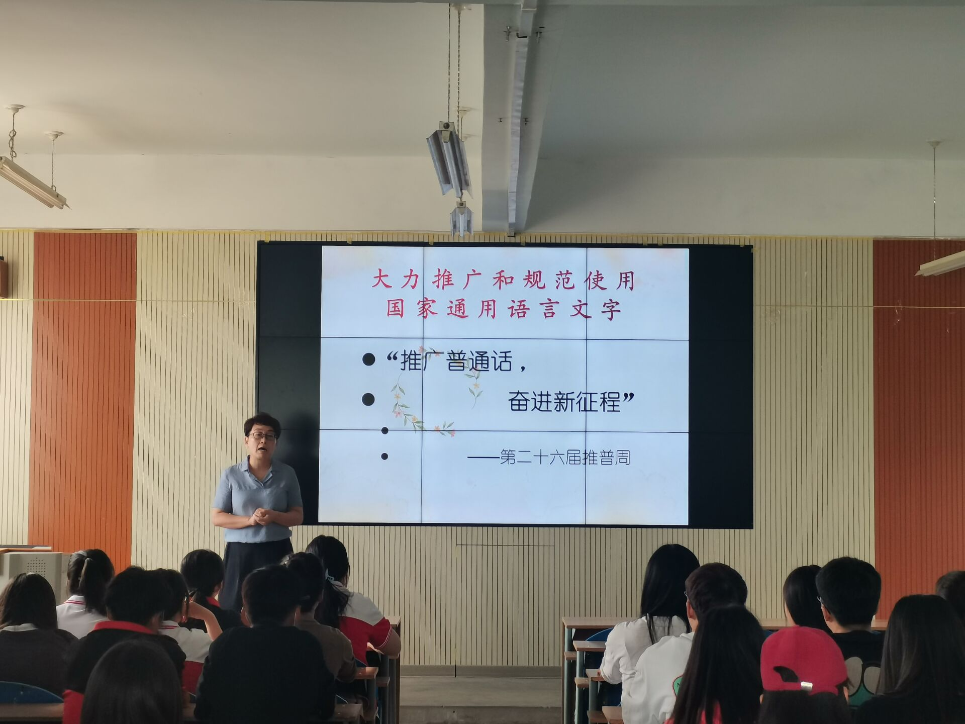 3、举办“推广普通话,奋进新征程”主题讲座。学院汉语言文学专业副教授黄焱在行知楼508教室举行专题讲座,生动分析了语言文字不规范使用现象造成的危害,使学生们在说普通话和语言文字规范化使用方面达成共识,进一步认识了“人人讲普通话 事事用规范字”的好处。