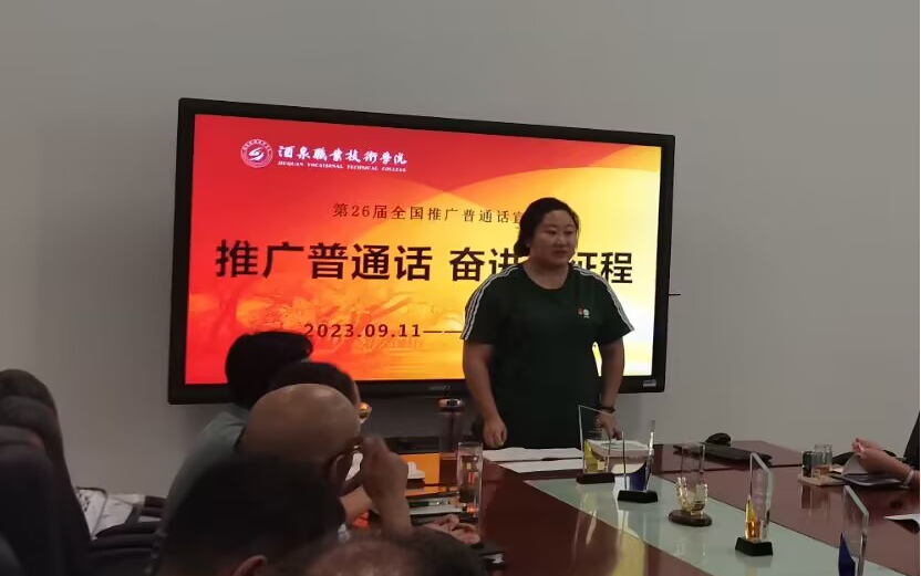 4、开展教师普通话水平提升专题培训。学院组织全体教师进行汉语拼音“大练兵”“大纠察”,袁霓老师分享交流了甘肃省第十七期省级普通话水平测试员资格考核培训班的学习成果,解读了新版《普通话水平测试实施纲要》的主要内容及变化。通过经验分享与语言测验,强化了教师规范使用国家语言文字的意识,提升了教师的基本素质。