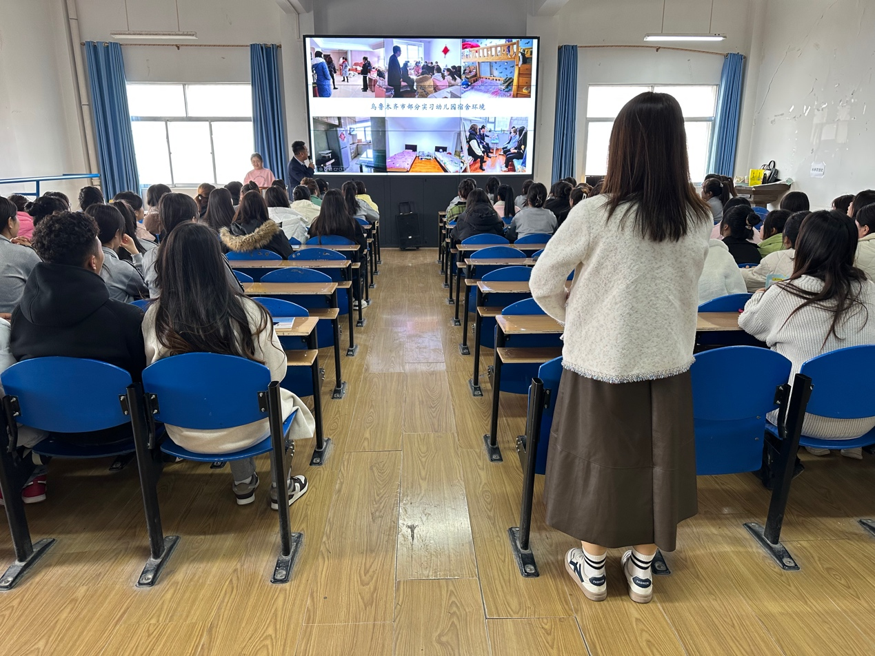 宣讲会上,新疆鲲鹏教育集团负责人李新民老师从幼儿园的工作环境、具体工作职责、未来发展前景等方面做了详细的介绍,并现场解答同学们提出的各类问题,给予参考性建议。随后,学院2022届优秀毕业生张子垚向应届毕业生分享了她的个人就业经历,讲述了在新疆实习就业的奋斗历程,并鼓励学弟学妹们勇于尝试,积极踏出求职第一步。
