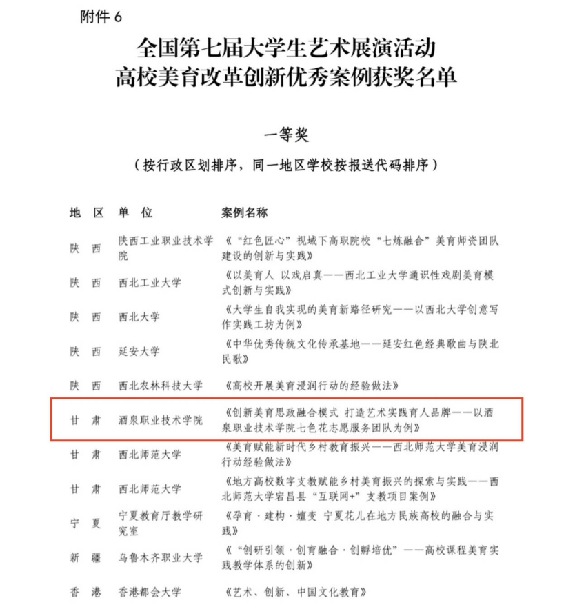 教育部办公厅必赢766net手机版公布《全国第七届大学生艺术展演活动高校美育改革创新优秀案例获奖名单》,必赢766net手机版七色花志愿服务团队的美育改革创新案例《创新美育思政融合模式打造艺术实践育人品牌——以酒泉职业技术学院七色花志愿服务团队为例》荣获一等奖。