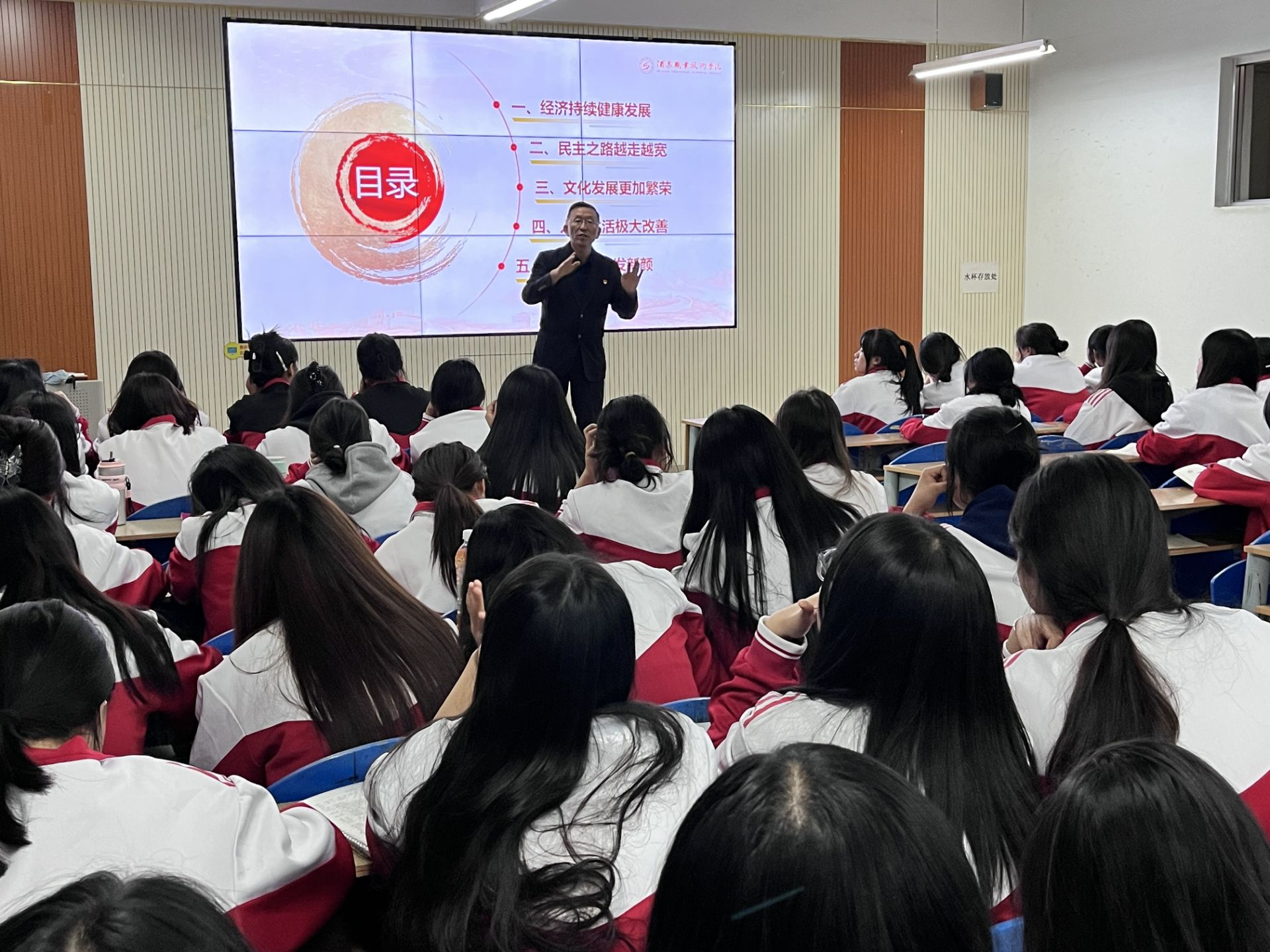 2024年11月4日,党委书记易志军以“七十五载迎盛世,砥砺前行续华章”为题,为2023级学生讲授秋季学期形势与政策第二课。