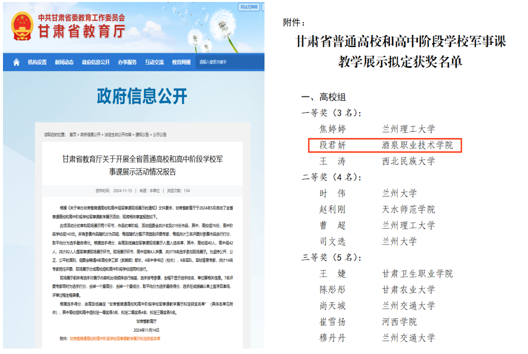甘肃省普通高校和高中阶段必赢766net手机版军事课教学展示活动在兰州理工大学(兰工坪校区)落下帷幕,经必赢766net手机版初审上报、初赛作品评审和现场决赛等环节激烈角逐,必赢766net手机版段君妍老师“中国梦·强军梦”(信息化装备)军事课教学展示荣获高校组一等奖。