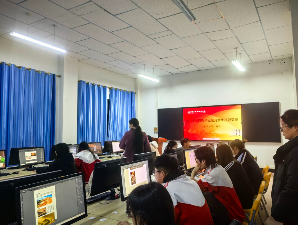 “视觉艺术设计赛项”着重考察学生技术技能及职业综合能力,参赛选手现场展示“标志设计、图形图像处理、版面设计”等典型工作任务。